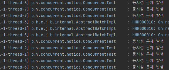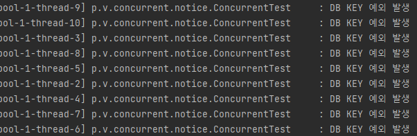 총 10개의 스레드로 테스트해보았고, 가장 먼저 commit 된 스레드를 제외하고 9개의 스레드는 DB 유니크 제약조건으로 인해 DataViolationException 예외가 발생하고 롤백을 예상했다.