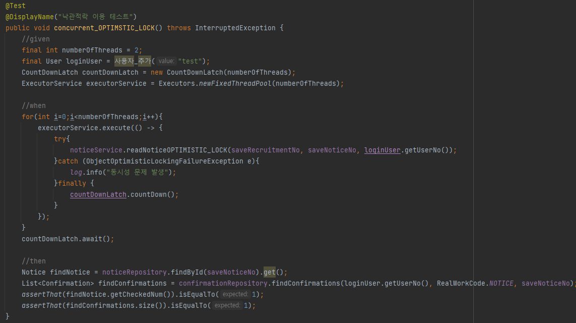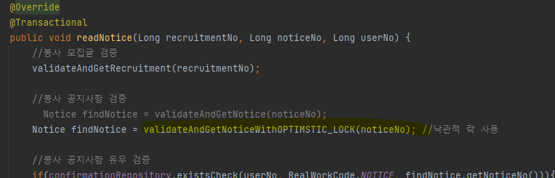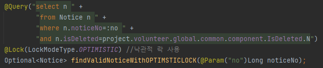 기존 비지니스 로직에서, 공지사항 검색 시 낙관적 락이 사용되도록 @Lock(LockModeType.OPTIMISTIC)를 추가했다.