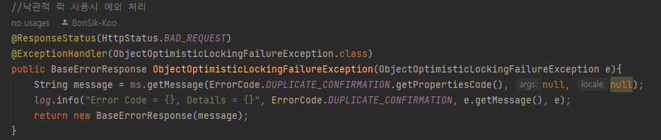 마지막으로, 비지니스 로직에서 발생한 ObjectOptimisticLockingFailureException 예외를
