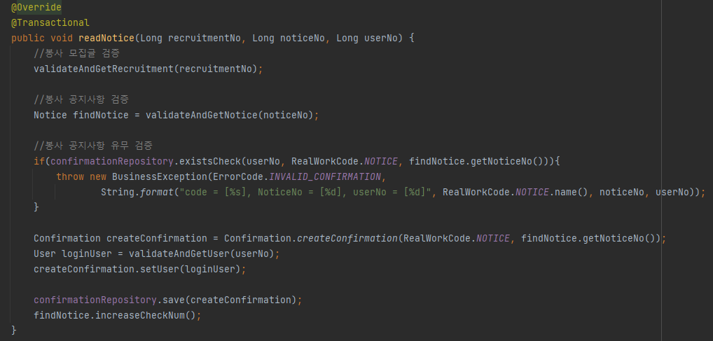 또한, 읽음 확인 엔티티와 공지사항 엔티티는 FK 연관관계가 없는 간접 참조를 하고있어, 데드락 발생 확률도 거의 없을 거같다 생각했다.