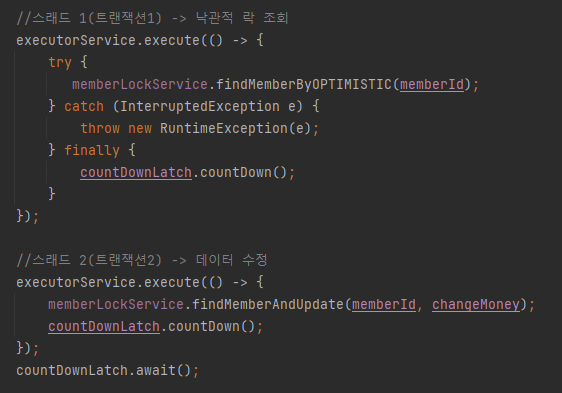 스레드1은 데이터를 OPTIMISTIC 조회하고 난 뒤, Sleep()를 이용해서 commit 전 스레드 2를 통해해당 데이터가 변경되도록 했다.