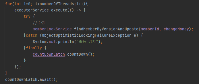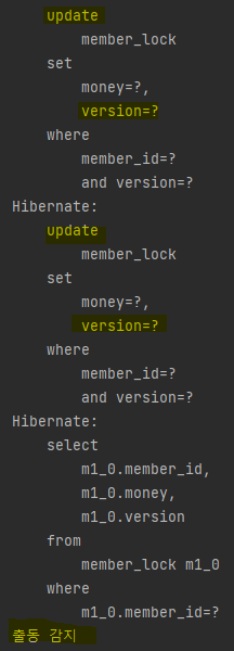충돌 감지 메시지가 출력된 것을 보아 ObjectOptimisticLockingFilureException 예외가 발생한 것을 알 수 있다.