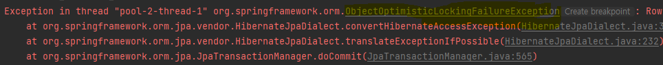 또한, 조회 한 데이터 버전과 커밋 전 데이터 버전이 일치하지 않아 ObjectOptimisticLockingFilureException예외가 발생하는 것을 볼 수 있다.