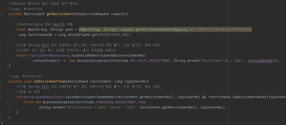 getRecruitment() 메서드를 통해 URL PATH로 전달되는 봉사 모집글 고유번호를 파싱하게 된다.