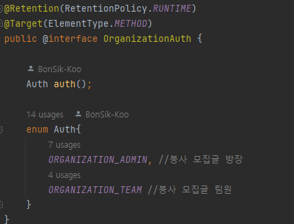 또한, 어노테이션을 새로 정의하여 어노테이션 유무에 따라 로직 실행을 결정하게 되고, 대상(admin,team)에 맞는 메서드를 호출되게 된다.