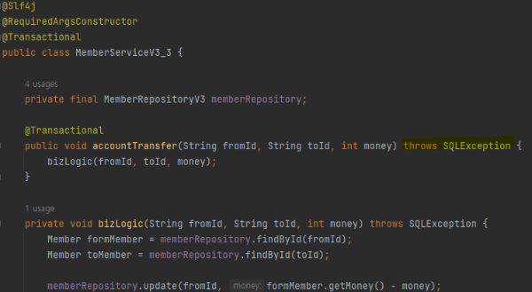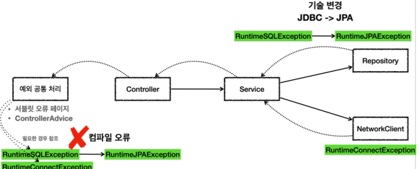 또한, JDBC 기술에서 JPA, MyBatis 등의 다른 기술로 교체가 발생할 시 해당 기술에 맞는 예외로 교체해주지 않으면