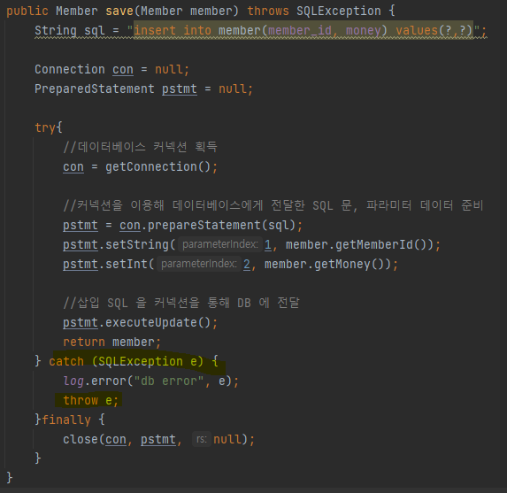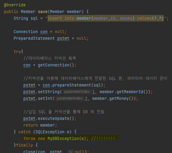 기존에는 체크 에외 SQLException을 그대로 던졌다면, 이를 런타임 예외로 교체해서 던지게 된다.