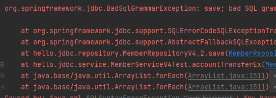 실제 SQL 문법 예외를 발생시키게 되면 아래와 같이 BasSqlGrammarException의 스프링 예외를 반환해주는 것을 볼 수 있다.