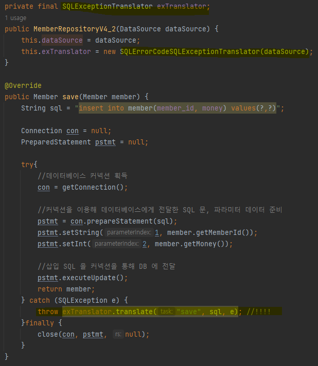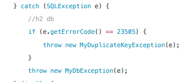 간단히 코드 통해 보자면, SQLException 내부의 errorCode를 이용해서 다른 런타임 예외를 던지면 된다.