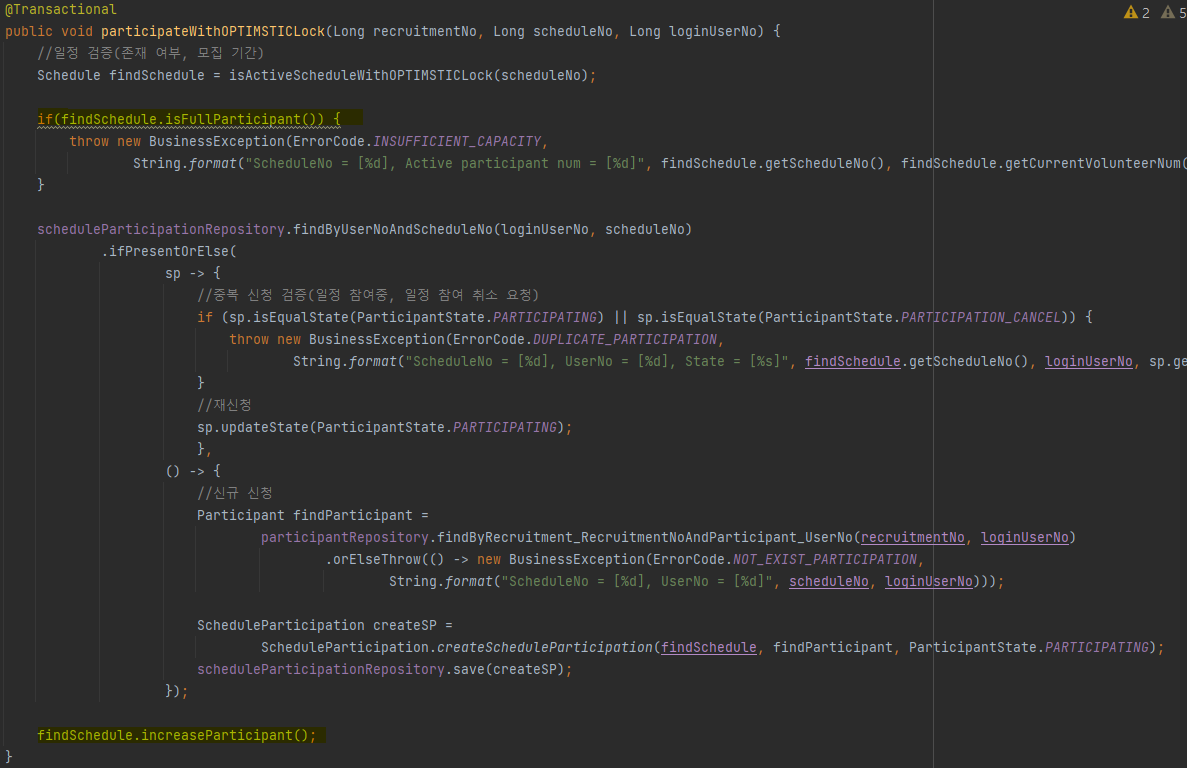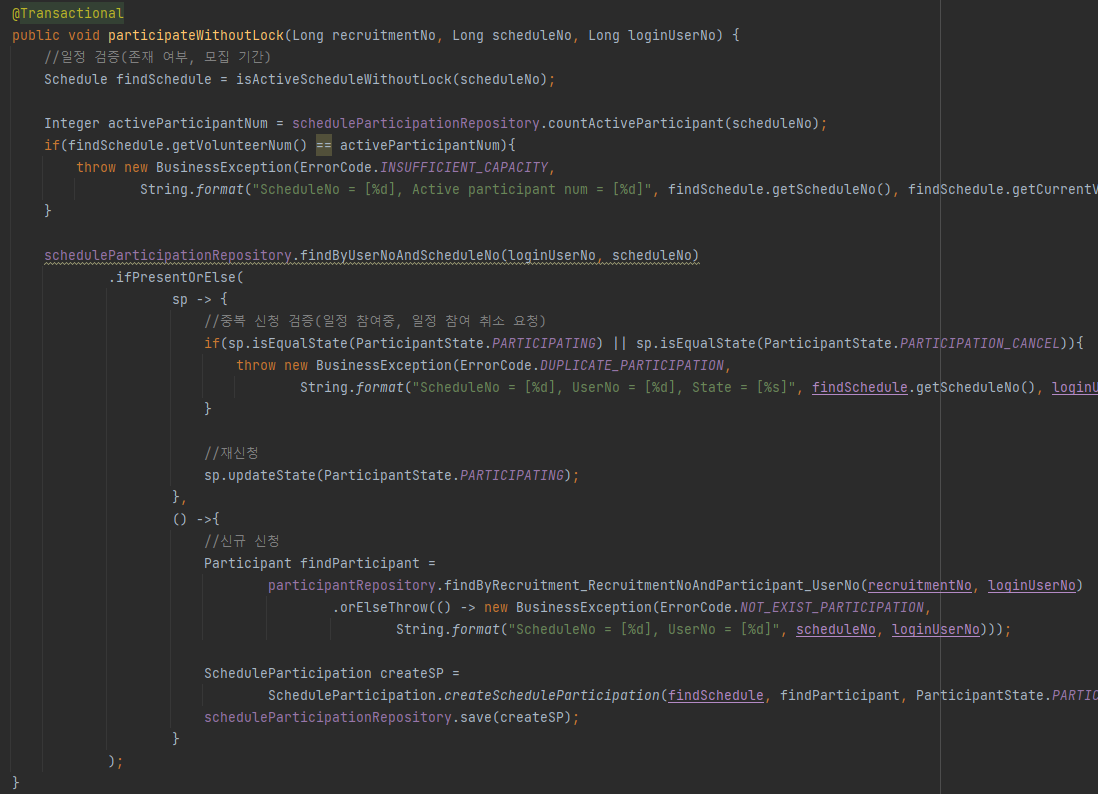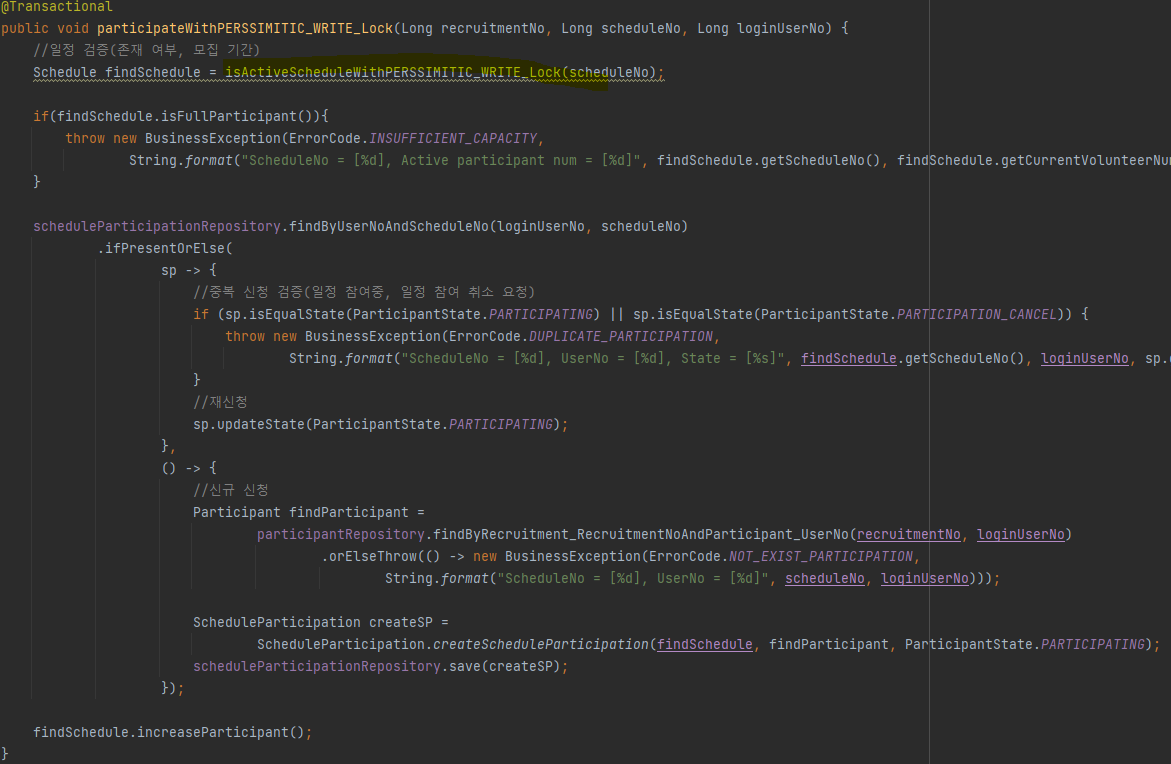 위는 코드는 일정 참가 신청시 호출되는 Service 메서드이다.