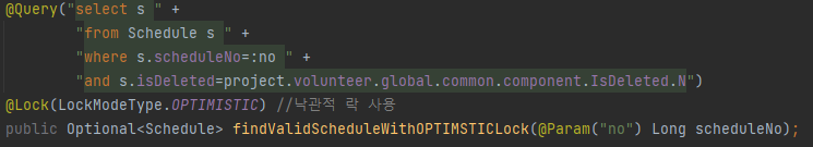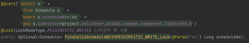그러므로, 성능 이슈의 영향도 적을 거라 판단하고 비관적 락을 사용해 해결해보고자 한다.
