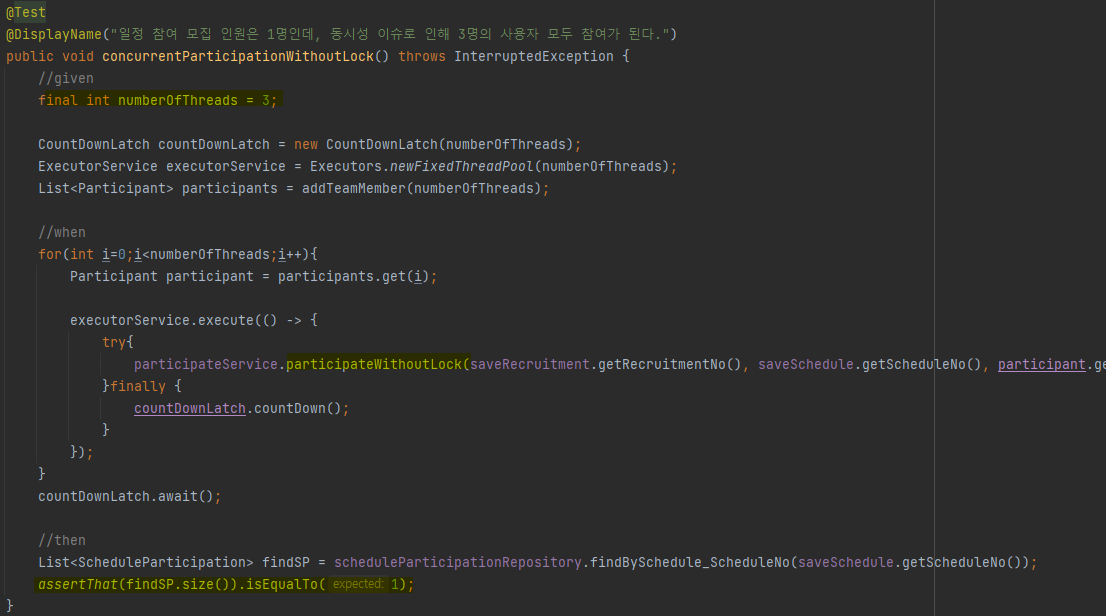 간략하게 설명하자면, 일정 A를 3명의 사용자가 동시에 조회하고, 참가 가능인원을 검증했을 때 모두 True가 나오기 때문에 3명의 참가자 모두 DB에 insert 되는 것이다.!
