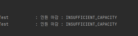 비지니스 로직에서 인원 마감 시, BusinessException(ErrorCode.INSUFFICIENT_CAPACITY ~) 예외가 발생하도록 했으므로 테스트 결과 "인원 마감~" 의 로그가 출력되어야 할 것이다. 과연...결과는?.....