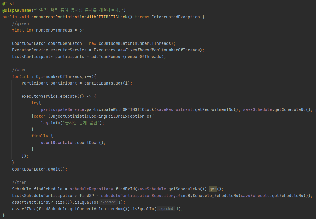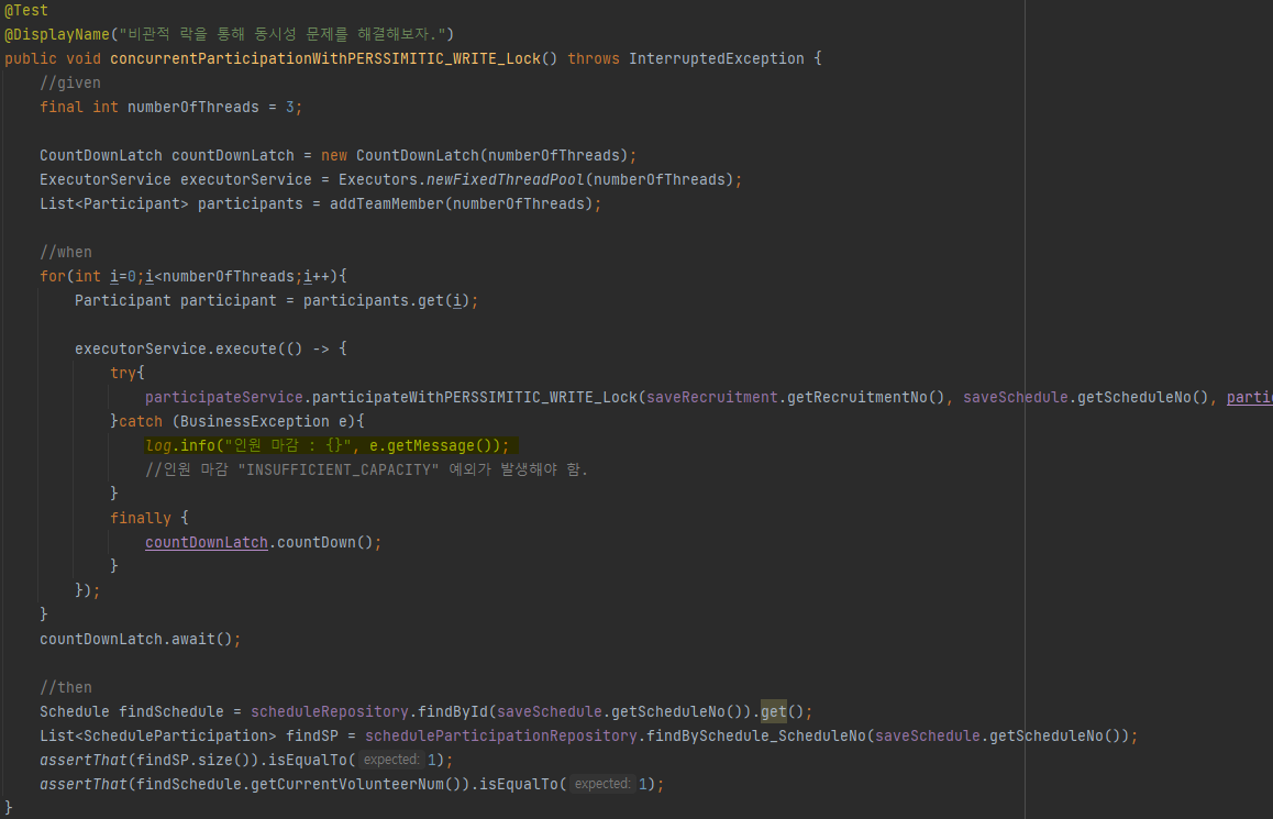 즉, 봉사 일정에 참가 가능한 인원이 한명이고, 3명의 신청자가 동시에 참가 신청을 했을 때 동시성 이슈로 인해 모두 참가되는 문제가 발생한 것이다.